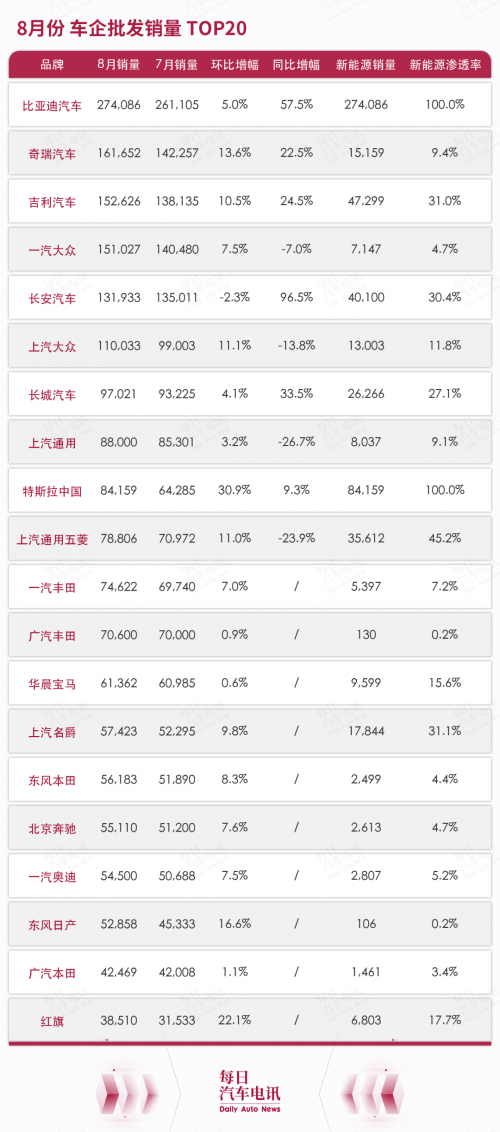 解读8月销量:比亚迪、奇瑞和吉利包揽前三,特斯拉Model Y单款销量突破6万辆