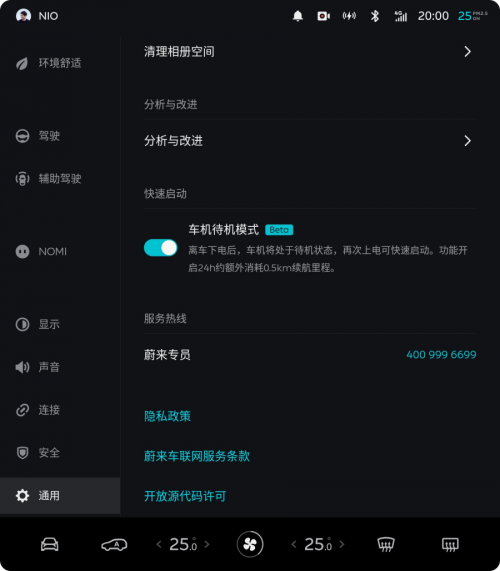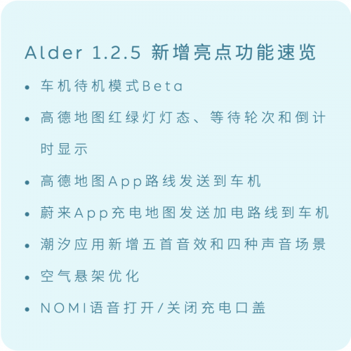 此外,Alder 1.2.5 版本新增车机待机模式 Beta,可以让车机在离车下电后处于待机状态,再次开门上车时,车机屏幕可以快速进行启动,但开启该功能后 24 小时大约减少 0.5 公里的续航里程。