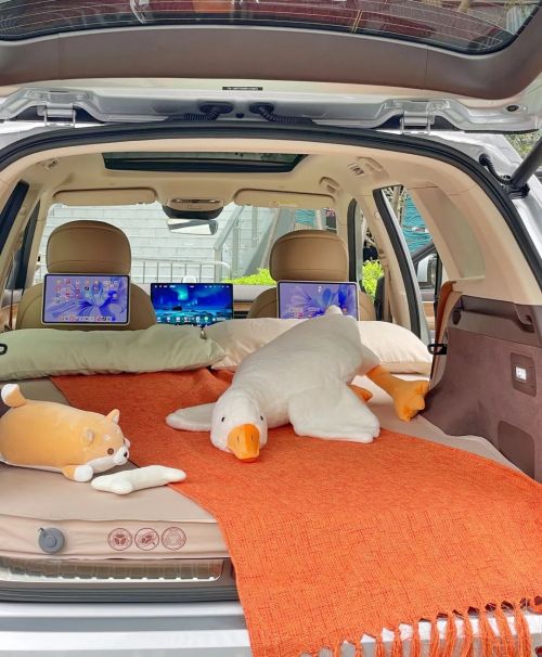 在发布会外场,一辆新款问界 M7 展示第二排放倒后的 2 米大床后排空间 | 极客公园