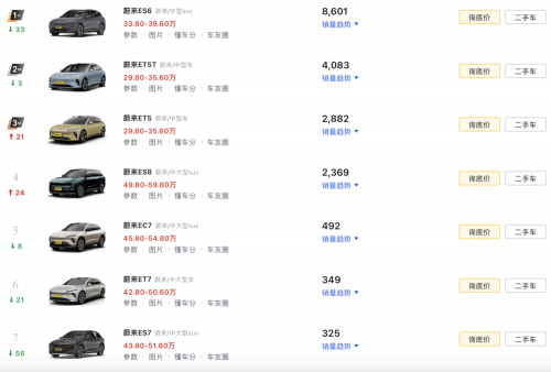 此后,蔚来又先后推出了中大型纯电动SUV ES7、中大型纯电轿跑SUV EC7。但这两款车都没有实现持续的热销。事实上在近几个月,这三款车的销量每月加在一起都不到2000辆,在整个新能源汽车市场中影响力实在微不足道。