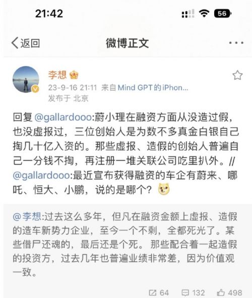 上周末,理想创始人在李想在兼职「售课」之于,在微博上发出评论,说「在融资金额上造假的造车公司,已经死光了。即便某些借尸还魂,最后还是个死。」