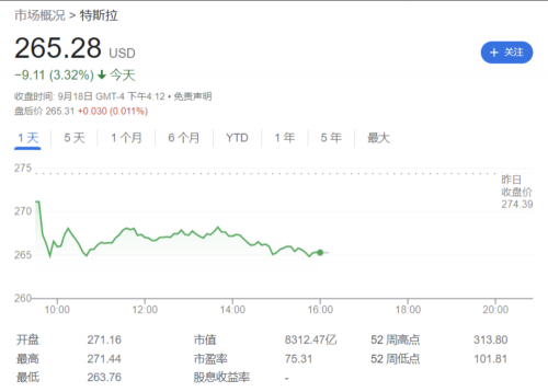 9月18日周一,特斯拉低开低走,收跌3.32%,报265.28美元。