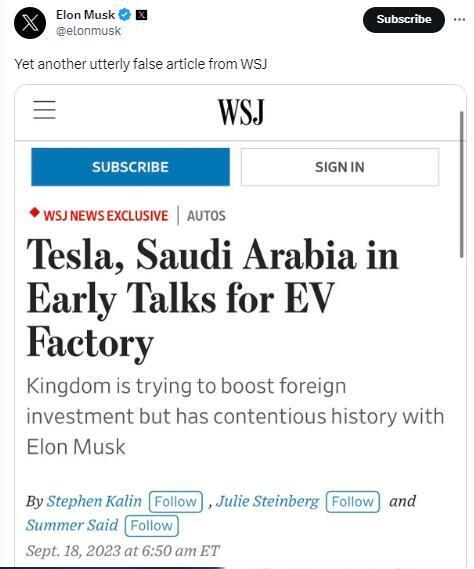马斯克则是在原名推特的社交媒体X发帖,将有关特斯拉和沙特初步磋商建厂的报道斥为“又一篇彻头彻尾的虚假文章”,并配上了该报道标题和摘要及发布时间的截图。