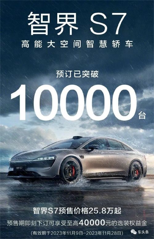 摘要:11月14日消息,昨日,智界宣布智界S7预定已突破1万台。据了解,智界S7在11月9日晚正式开启预售,其定位是高能大空间智慧轿车,共四款配置,预售价25.8万元起,新车将于11月28日正式发布。