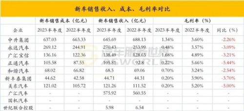 (10家上市经销商新车销售收入、成本及毛利率对比)
