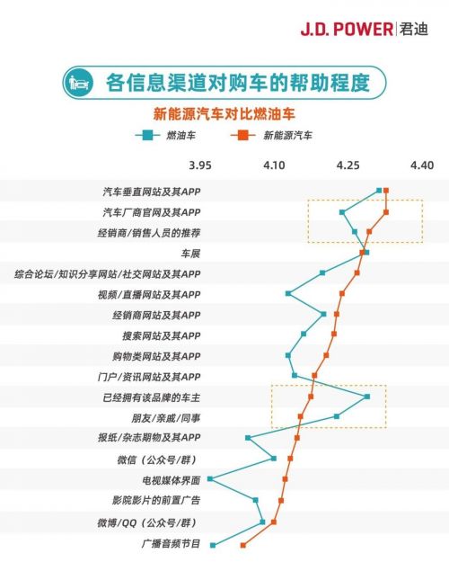 从2020年前后消费者买车的决策路径来看,对比互联网垂煤和互联网泛煤,一个趋势是,互联网泛媒拥有了更加长链条的营销和直接转化能力,对整个决策路径的影响越来愈大。同样地,针对汽车意向购买者的媒介偏好及购买影响因素,J.D. Power中国汽车媒体研究(AMS)的报告对比了各信息渠道对新能源汽车车主和燃油车车主的帮助程度,从图中可看:
