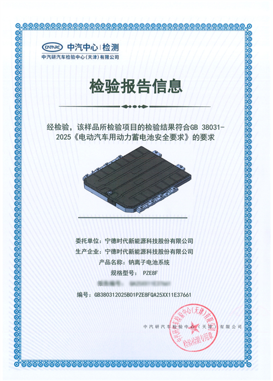在由中汽中心新能源检测中心执行的第三方权威测试中,宁德时代钠新电池在电芯与电池包层级均表现出优异的安全性能,顺利通过各项试验。