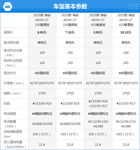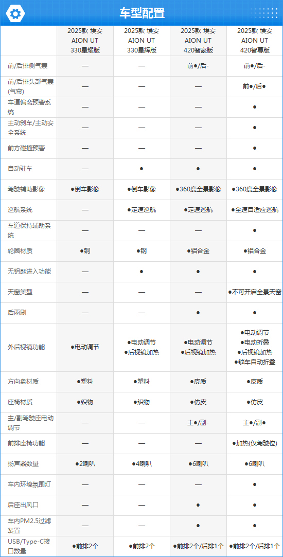 通过配置对比发现,2025款埃安AION UT虽然均配备后置单电机,但根据车型配置不同,CLTC纯电续航里程分为330km和420km两种。此外,配置方面顶配车型的表现更为出色,独享全速自适应巡航、不可开启全景天窗、主驾驶位座椅加热、车内环境氛围灯以及更为丰富的主/被动安全功能等。