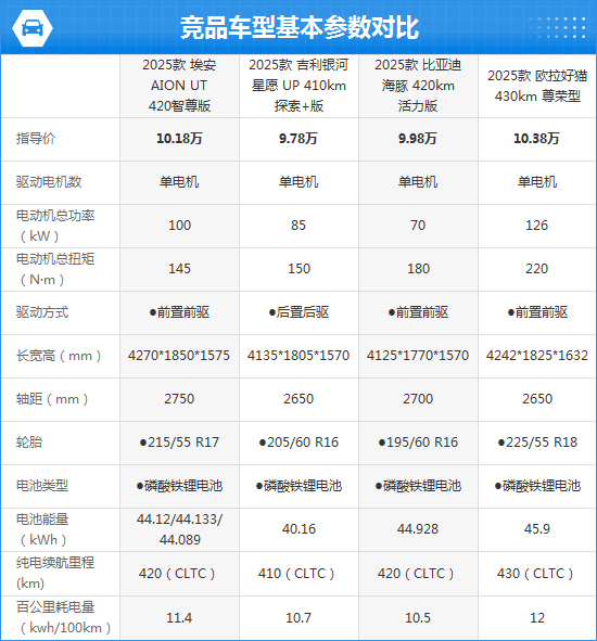 与竞品车型相比,虽然2025款埃安AION UT的配置表现并非四款车中最丰富的,但也处于中上游水平。比如时下流行的辅助驾驶、主动安全等功能均有提供,并且还独享后雨刷以及第二排座椅靠背调节等功能,可以为日常代步提供便利、舒适和安全的体验。
