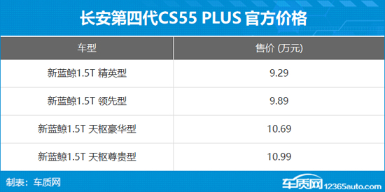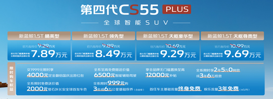 2025年9月25日,长安汽车官方宣布,旗下第四代CS55 PLUS正式上市,共推出4款车型,售价区间9.29-10.99万元,叠加无门槛置换补贴及限时国庆出游红包后售价7.89-9.69万元。新车采用全新的“纵横万象”家族设计语言,搭载长安汽车天枢辅助驾驶视觉版以及新蓝鲸1.5T动力。