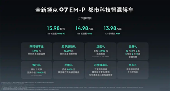 新款领克07 EM-P上市,共推出3款车型,官方指导售价区间为15.58-17.58万元,上市限时价区间为13.98-15.98万元。