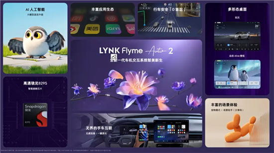 车内搭载LYNK Flyme Auto 2魅族车机系统,支持ICCOA1.6(小米/oppo/Vivo)、HiCar、CarPlay(后续OTA)等多款手机生态互联,同时支持无线投屏。