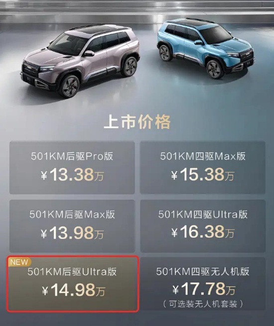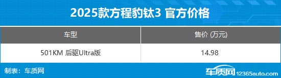 今日,我们从方程豹官方获悉,旗下方程豹钛3新增501KM后驱Ultra版正式上市,售价为14.98万元。新车新增了微光粉和冰晶蓝车漆色可供消费者选择。