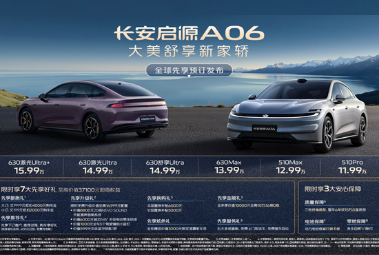 9月28日,长安启源全新车型A06开启预售,新车基于长安SDA全球纯电架构打造,共推出6款车型,预售价格11.99-15.99万元,并推出先享升级礼、先享推荐礼、先享服务礼等权益。