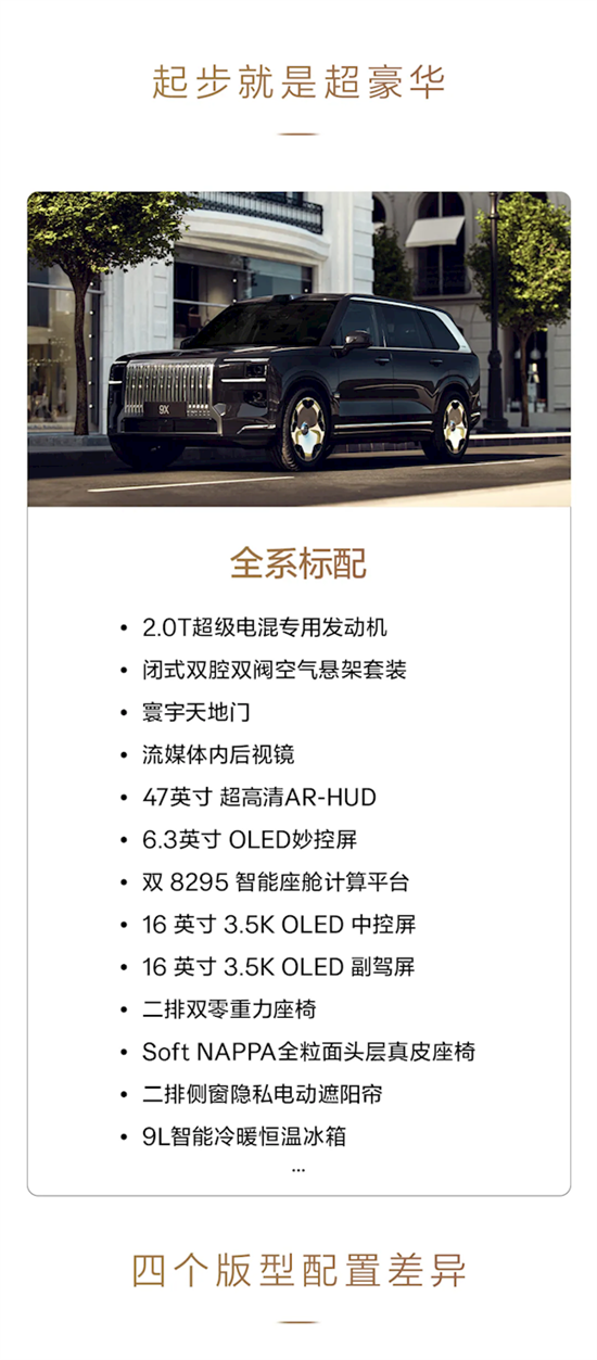 新车起步就是Max版,入门配置就相当于其它车型的豪华版,全系标配2.0T超级电混专用发动机、闭式双腔双阀空气悬架套装、寰宇天地门、47英寸超高清AR-HUD、双8295智能座舱计算平台、16英寸3.5K OLED中控副驾双联屏、二排双零重力座椅、9L智能冷暖恒温冰箱等。