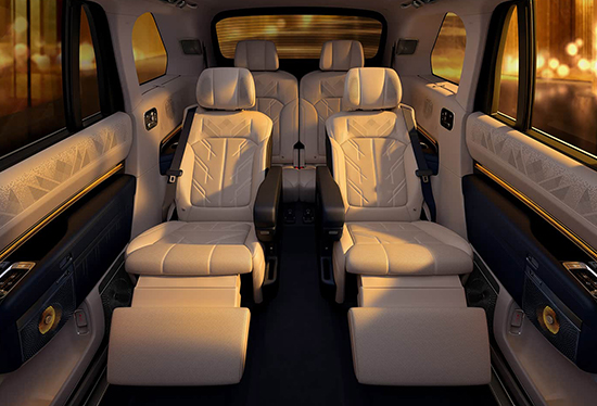 车身侧面线条平直规整,独特的“飞桥游艇式”车顶设计个性鲜明,粗壮的D柱则进一步强化力量感。新车提供22英寸镜面锻造轮毂,豪华感十足;后排车门最大开启宽度超过1m,开合角度接近直角,出入更加优雅。