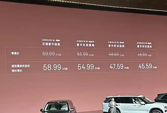 9月29日,极氪旗下全新大型SUV——极氪9X正式上市,新车共推出4款车型,官方售价区间为46.59-59.99万元,置换权益后限时售价为45.59-58.99万元。同时,官方还推出价值85000元豪华进阶礼。