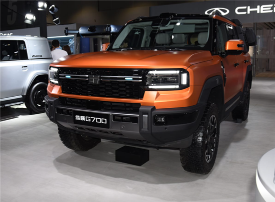 新车采用“方盒子”造型设计,车身线条硬朗,并配备越野风格前保险杠以及宽体式轮眉,塑造出十足的力量感。方形LED前大灯采用分层式日间行车灯设计,搭配贯穿中网的双横条镀铬装饰,进一步拉伸了整车的视觉宽度。