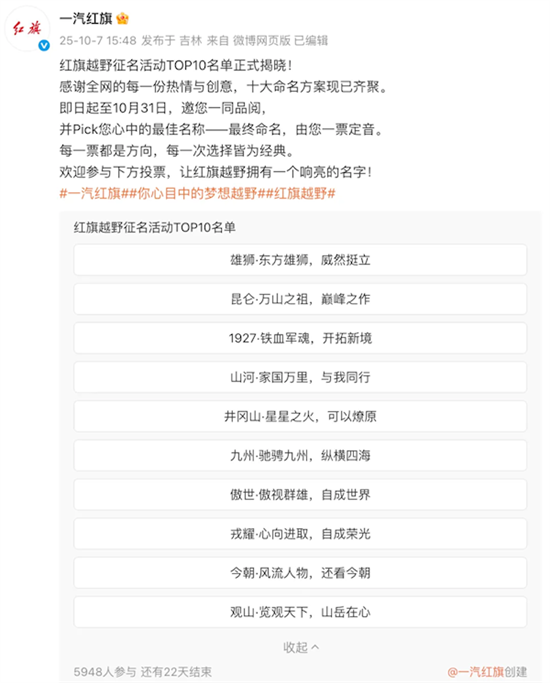 一汽红旗表示,最终命名将由大众投票而来,一汽红旗也郑重承诺新车上市时,将向最终车名的建议者免费赠送“红旗越野”001号车。投票时间为2025年10月8日-2025年10月31日。