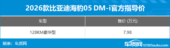 日前,车质网从官方获悉,2026款海豹05 DM-i正式上市,此次仅推出1款车型,售价7.98万元。新车在配置上与智驾版55KM豪华型基本保持一致,售价不变,CLTC纯电续航提升至128km。