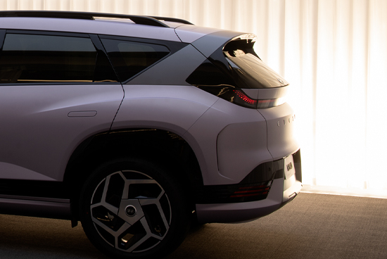 车身侧面采用溜背式设计,搭配双色车身与20英寸轮毂,运动氛围呼之欲出;隐藏式门把手的加入不仅提升了视觉简洁度,也有效降低了风阻。尾部方面,ELEXIO采用贯穿式尾灯设计,与前脸形成呼应,硕大的后包围造型动感十足,进一步凸显整车的年轻与运动气质。