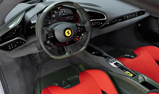 内饰方面,新车延续了经典与现代相互融合的思路,脚踏区、座椅靠背、仪表台和方向盘装饰件均采用碳-凯夫拉复合材料,其曾经助力法拉利F40实现极致轻量化的材质,如今以更先进工艺重现江湖。座椅采用红色提花织物和黑色Alcantara材质拼接,并还原了F40简约绒面仪表板的运动风格。