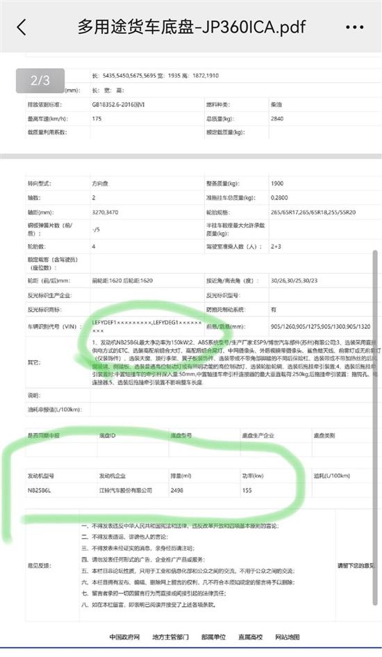 性能与承载上,新车燃料种类为柴油,排放符合 GB18352.6-2016 国 VI 标准,最高车速可达 175km/h,总质量为 2840kg,整备质量 1900kg,准拖挂车总质量为 0kg 或 2800kg,接近角统一为 30 度,离去角则根据配置不同为 23 度、25 度或 26 度,适配多种路况。轮胎规格提供 265/65R17、265/65R18、255/55R20 三类选择,驾驶室准乘人数为 2+3 人,满足载人与载物双重需求。