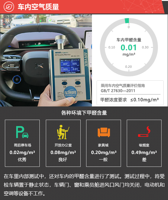 在车内空气质量测试环节,将车辆放置在车辆较少的内部地面停车场中,实测2025款小鹏P7的车内甲醛含量为0.01mg/m3,符合2012年3月1日起实施的,由原环保部和国家质量监督检验检疫总局联合发布的《乘用车内空气质量评价指南》(中华人民共和国国家标准GB/T 27630-2011)中的相关标准。