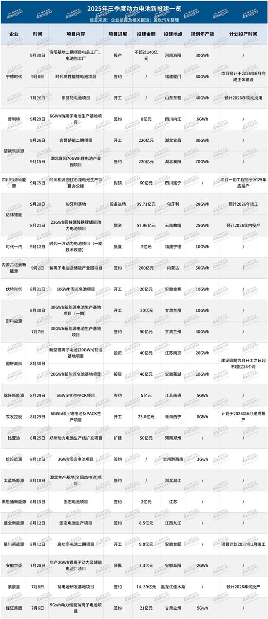 2025年三季度,在全球新能源汽车渗透率持续提升的驱动下,动力电池行业扩产热潮延续。据盖世汽车不完全统计,该季度动力电池及相关配套企业新投建项目超25个,总投资超1351亿元,规划年产能超600GWh,项目覆盖河南、山东、湖北、四川、安徽等多个省份。