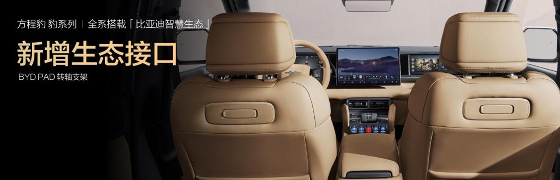 豹5长续航版、豹8大五座版上市即搭载钛7同款比亚迪智慧生态,通过生态设备的“全能管家”比亚迪智慧物联APP,无需复杂操作,也不需要手动连接多个设备,语音指令即能控制全车所有的生态产品。此外,两款新车型的前排座椅背后均加装了生态接口,插入转轴支架后,可以搭配BYD Pad使用。未来将有更多的生态产品,通过生态接口提供用户以智慧互联的无限体验。