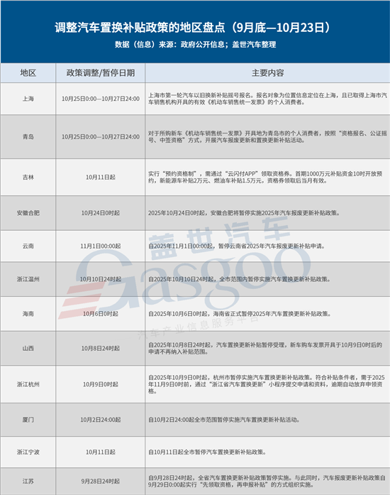 进入9月底至10月下旬,国内汽车补贴政策呈现 “调整与暂停并行” 态势。据盖世汽车不完全统计,截至10月23日,青岛、吉林、上海三地于10月先后调整汽车置换或报废补贴规则;与此同时,安徽合肥、云南、浙江温州、海南、山西、杭州等多省市,陆续宣布暂停汽车置换更新或报废更新补贴,并明确过渡期内符合条件消费者的申请截止时间及资料提交要求。此篇为近期各地汽车以旧换新政策调整及暂停情况的梳理汇总,供业界参考。