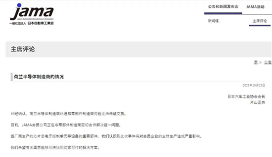日前,日本汽车工业协会(JAMA)通过官网发布声明,称已收到一家荷兰半导体制造商的通知,对方可能无法保证芯片正常交付。