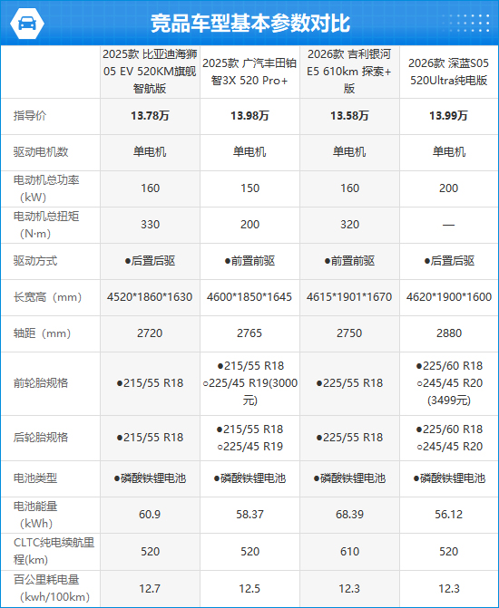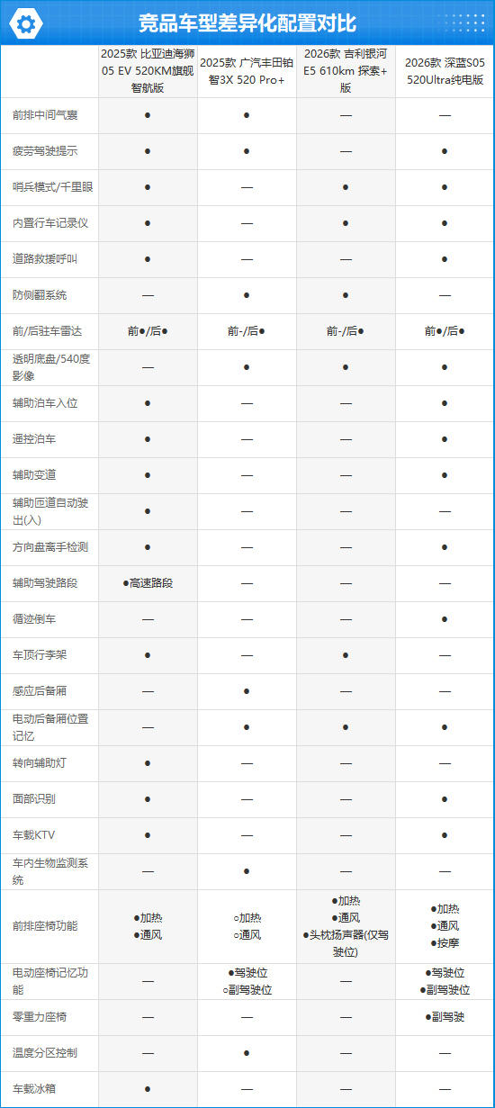 与竞品车型相比,2025款比亚迪海狮05 EV的表现明显好于2025款广汽丰田铂智3X和2026款吉利银河E5,特别是在辅助驾驶方面;而与2026款深蓝S05相比,两者互有胜负,配置水平在伯仲之间。不过,其独享的车载冰箱、转向辅助灯、高速路段辅助驾驶等配置,可以为车主带来更好的日常用车体验。