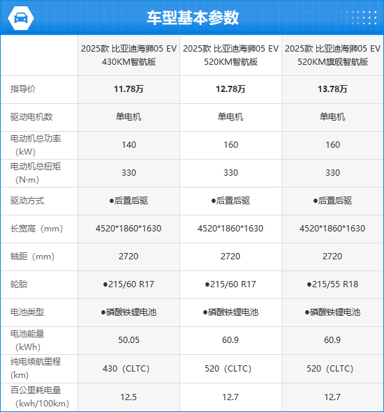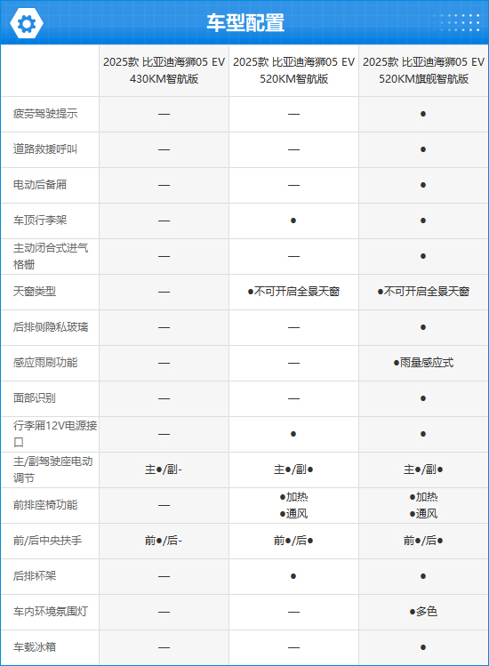 通过配置对比发现,2025款比亚迪海狮05 EV虽然均配备后置单电机,但根据车型配置不同,CLTC纯电续航里程分为430km和520km两种。配置方面,顶配版车型的表现更为出色,独享疲劳驾驶提示、道路救援呼叫、电动后备厢、雨量感应式雨刷和车载冰箱等,综合竞争力更强。