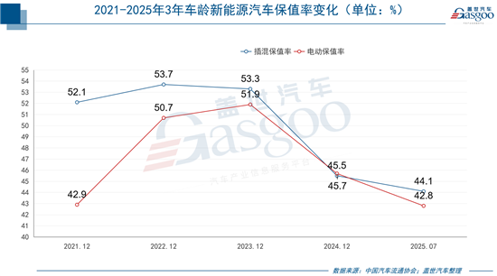 更值得关注的是,随着竞争白热化而来的持续价格战正在助推汽车"快消品"化。自2023年以来,新能源汽车行业展开持续的集体降价潮,新老车价格倒挂,车辆贬值加速。据中国汽车流通协会数据,新能源汽车3年保值率从2023年12月的平均52.6%下降至2025年7月的平均43.45%。