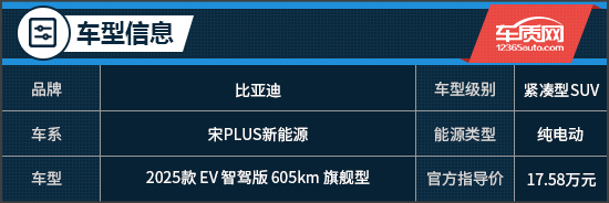 此次评测的车型是2025款宋PLUS EV 智驾版 605km 旗舰型,虽然名字像是王朝系列,但实际上它现在已归属于海洋系列。整车外观延续了家族化“海洋美学”设计理念,前脸通过多段流畅线条勾勒出如海浪般的动感型面。