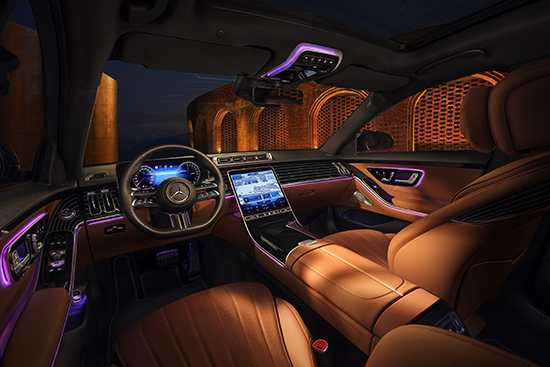 内饰部分,新车同样沿用老款车型的设计,前排配备带实景穿越的平视显示系统、12.3英寸3D数字仪表屏、12.8英寸OLED中央显示屏,可以与7英寸MBUX后排智能平板电脑和双11.6英寸的MBUX后排娱乐系统进行多屏联动。