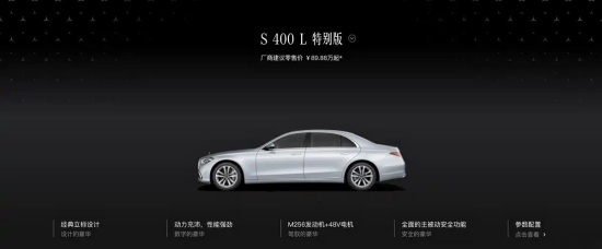 配置上,新增的S 400 L特别版相比S 400 L商务型减少后排智能空调、雾霾终结者3.0等,还取消了车内空气调节组件、主动式环境氛围灯、智能感应助理、后排用于移动设备的无线充电功能、自适应后排照明系统、MBUX后排智能平板电脑等选装配置,两款车型价差为6.38万元;S 450 L 4MATIC车型取消了遥控泊车组件,标配主动式环境氛围灯,MBUX高端后排娱乐系统由标配变更为选装,并且不再提供智能感应助理选装,售价下调5.49万元。