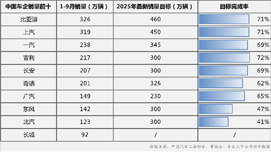 从销量前十车企来看,比亚迪和上汽集团处于行业头部,1-9月累计销量均已超300万辆。其中,排名第一的比亚迪1-9月销量达326万辆,已完成全年460万辆最新销量目标的71%,持续巩固其无可撼动的领先地位。上汽集团同期销量达到319.3万辆,目标完成率同样为71%,在燃油与新能源双线并行下保持稳健态势。