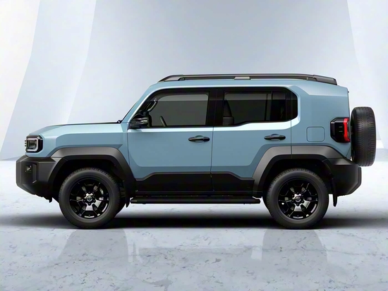 车身侧面来看,新车造型紧凑,由此前的三门设计改为五门结构,但每个车门尺寸较小,宽大的C柱依旧是标志性设计。外扩的轮眉、黑色侧裙以及黑化轮圈凸显了浓厚的越野风格。尺寸方面,新车长宽高分别为4575mm*1855mm*1960mm,轴距为2580mm,转弯半径为5.5m,并具备出色的接近角与离去角。