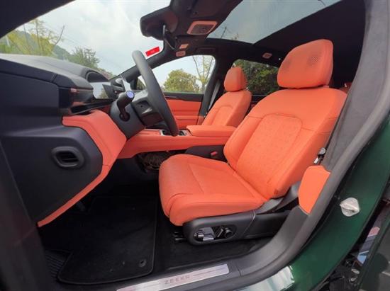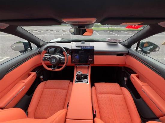 转至内饰,焕新极氪7X带来了显著升级,新增了黑紫和黑橙两款配色,我们体验的黑紫配色在夜幕之中如极光流动,尽显科技的深邃与神秘,黑橙配色则似破晓之光跃出深邃,为科技注入耀眼活力,此外还保留了纯黑、黑/灰等经典配色供消费者选择。座舱采用环抱式仪表台设计,横向延展的线条与多色氛围灯带共同营造出通透的空间感,中控台采用硬朗而平直的走线,宽大且包裹感十足,给人可靠的感觉。