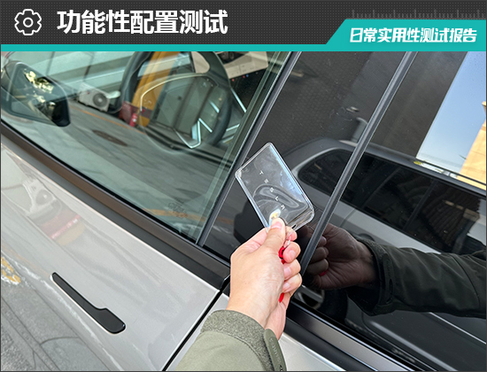 在功能性配置方面,评测车配备了全车无钥匙进入功能,并支持蓝牙钥匙、NFC/RFID钥匙、UWB数字钥匙进入方式,用户只需将钥匙贴在B柱感应区域,车辆便可自动解锁。上述操作在实测过程中并未出现失灵的情况。