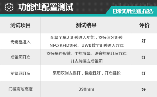 对于消费者来说,门槛离地高度一定程度上决定了上下车便利性。根据实测结果来看,评测车的门槛离地高度为390mm,达到同级别车型上游水平,驾乘人员日常上下车十分便捷。