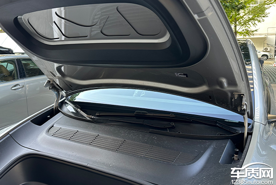 评测车的前备厢盖未设置机械开启开关,只需通过中控屏幕便可解锁,随后直接掀起前备厢盖即可。操作过程中,由于其采用了双侧支撑杆,并且重量较轻,操作起来比较省力。