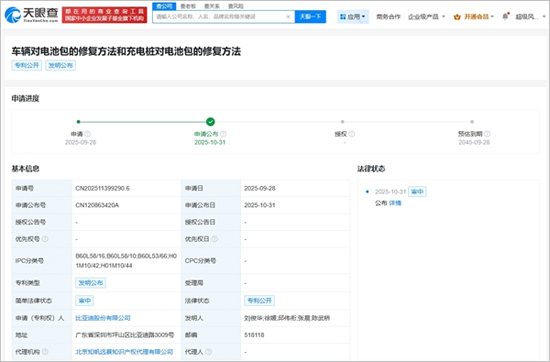 天眼查App显示,比亚迪股份有限公司申请的“车辆对电池包的修复方法和充电桩对电池包的修复方法”专利公布。