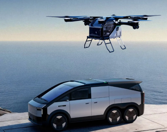 产品方面,小鹏汇天“陆地航母”采用独特的3轴6轮设计,车身长宽高均为5500/2000/2000毫米,四座布局,仅需普通C类驾照即可驾驶。该车搭载全球首个800V碳化硅增程动力平台,CLTC工况续航里程超1000公里,配备6x6全轮驱动系统及后轮转向技术,兼顾越野性能与承载能力。其飞行器部分隐藏于后备厢内,支持18分钟快充(电量从30%充至80%),满油满电状态下可完成5至6次飞行任务。飞行器采用四螺旋桨设计,机舱可容纳两人,并具备一键自动起降、自主航行功能,用户仅需5分钟即可掌握基本操作。