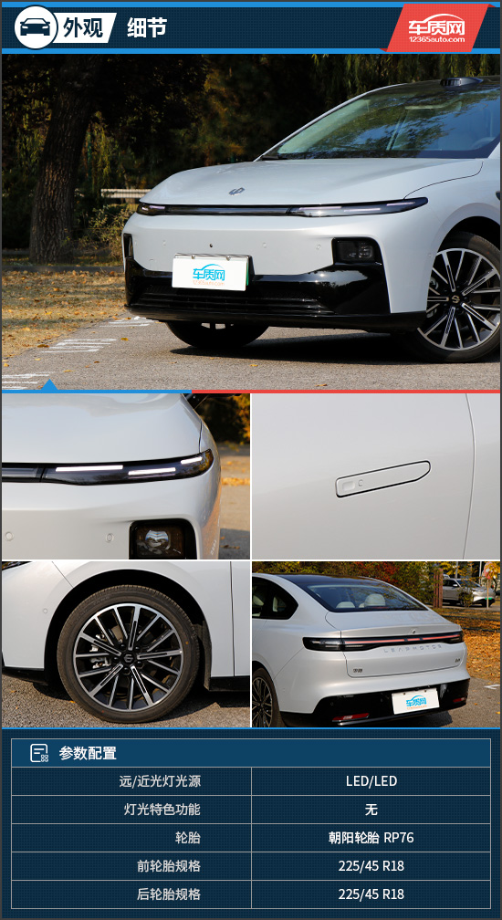 细节方面,评测车配备了AGS主动式进气格栅,能有效降低风阻系数、提升续航表现。轮毂采用了18英寸星芒运动轮毂,能够进一步彰显年轻与力量感,与之匹配的轮胎来自朝阳轮胎RP76系列,主打安全、舒适,具体规格为225/45 R18。