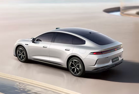 侧面线条简约、流畅,溜背式车顶和半隐藏式门把手不仅提升视觉延展性,也有助于降低风阻。外后视镜上还嵌入了用于智驾状态提示的小蓝灯,很有科技感。尾部配备迎宾流水动效的贯穿式尾灯,274颗灯珠环绕点亮,颇具辨识度。