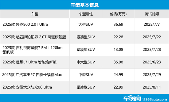 本期选取的6款车型包括3款紧凑型SUV、1款中型SUV、1款中大型SUV和1款大型SUV,涵盖自主、合资品牌车型,既有传统燃油车,也有新能源车。