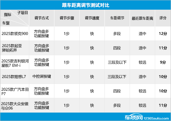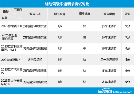 在车速调节项目中,6款车型的整体表现符合预期。虽然调节方式存在差异,但是在调节步骤方面均表现一致。而在调节速度方面,只有2025款吉利银河星舰7 EM-i(以下简称:吉利银河星舰7 EM-i)为中,其余车型均为快。调节幅度方面,理想L7不支持多车速调节,导致其出现失分情况,略有遗憾。